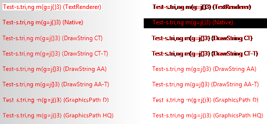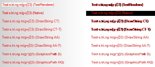To get the idea how different text rendering method compares visually I start by rendering the same string ("Test-s.tri,ng m(g=j{}3)"), using the same font (Arial 11p regular), in two columns: the left has gradient background from grey to white and the right has transparent background, using eight rendering methods: (top to bottom)